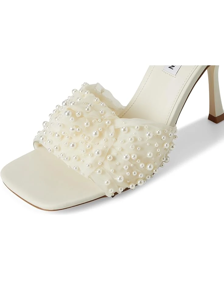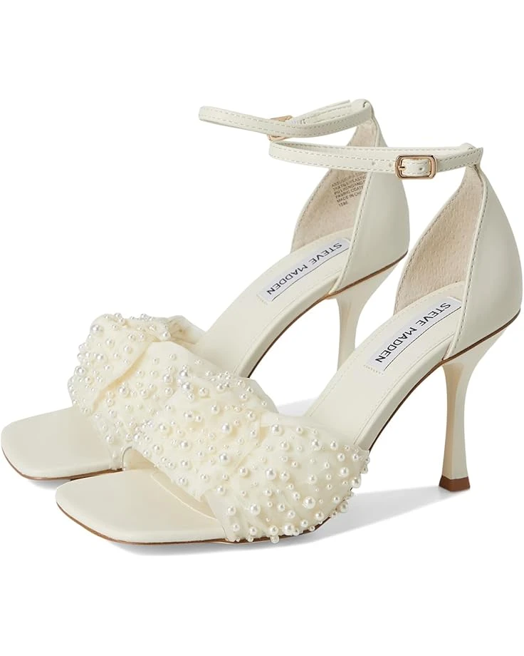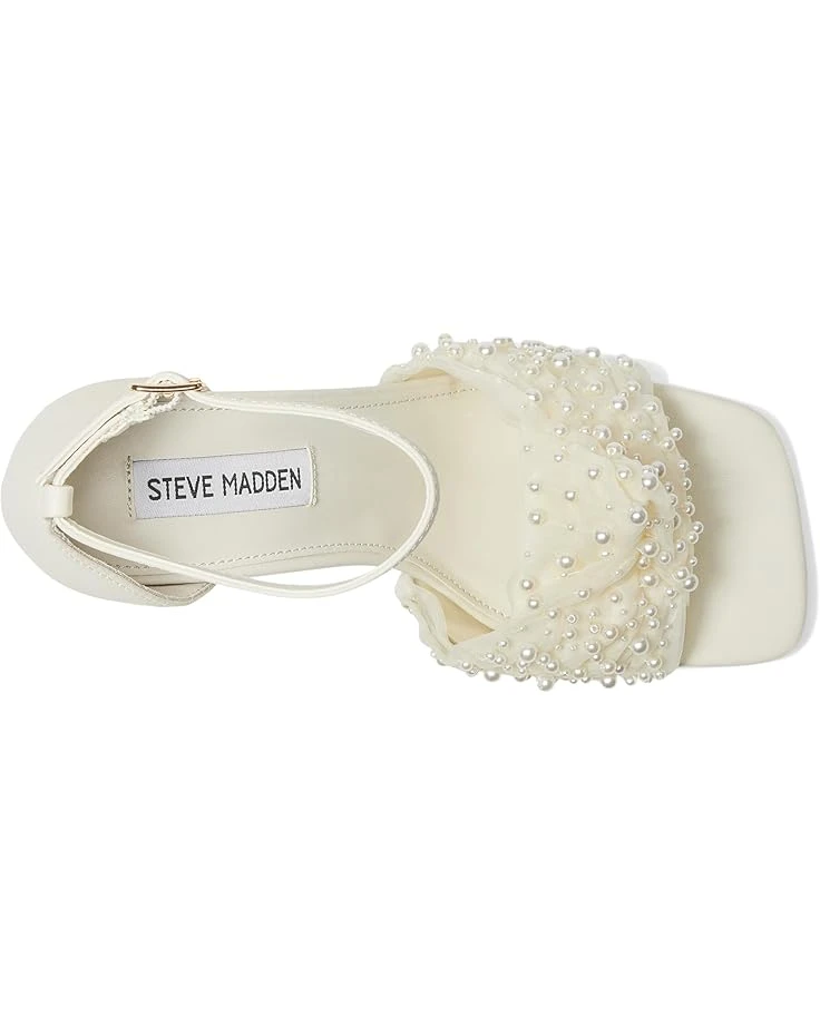 - The ASSUME-P by Steve Madden® features chiffon with pearl detailing to compliment any outfit. The high stiletto heels add height and elegance while the square toe design gives it a contemporary feel. The heels are crafted from faux leather upper, synthetic lining, and faux leather insole.
