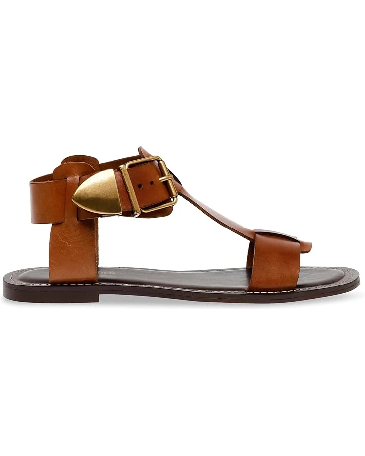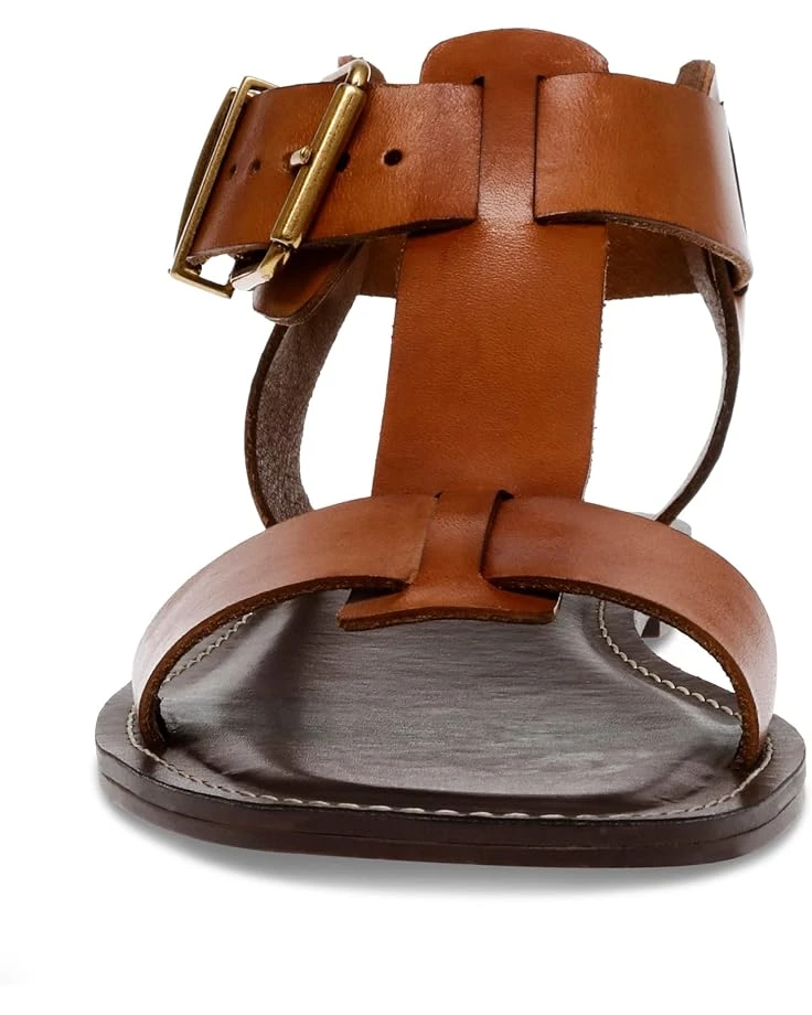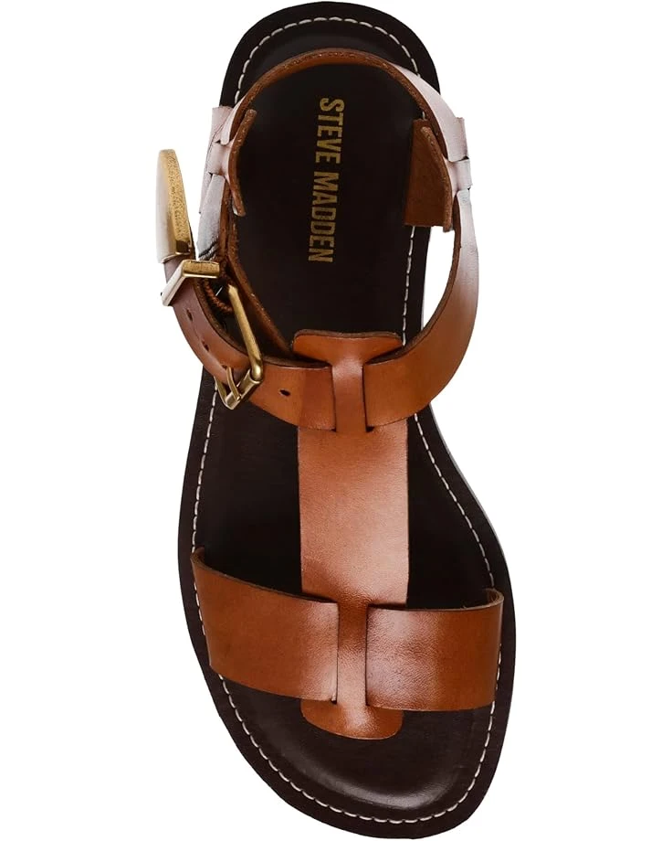 - Experience summer like never before wearing the classic style Steve Madden® Brazzin. Crafted from leather upper, lining, and synthetic insole, this pair of gladiator style sandals features open round toe silhouette, adjustable buckle closure on ankle strap, stacked heel, and large gold buckle detailing on ankle strap.