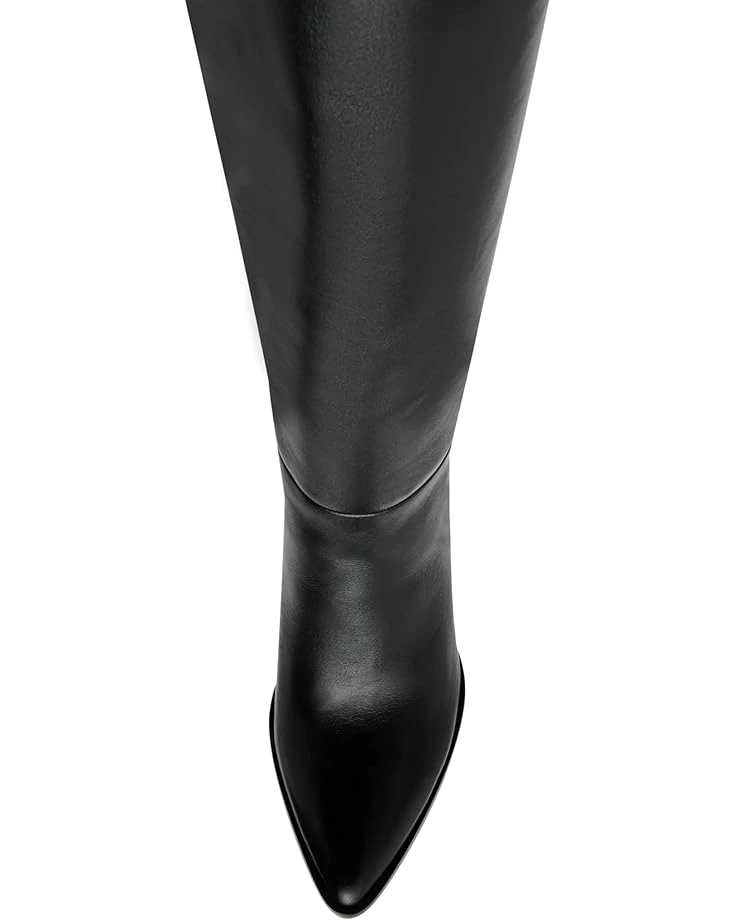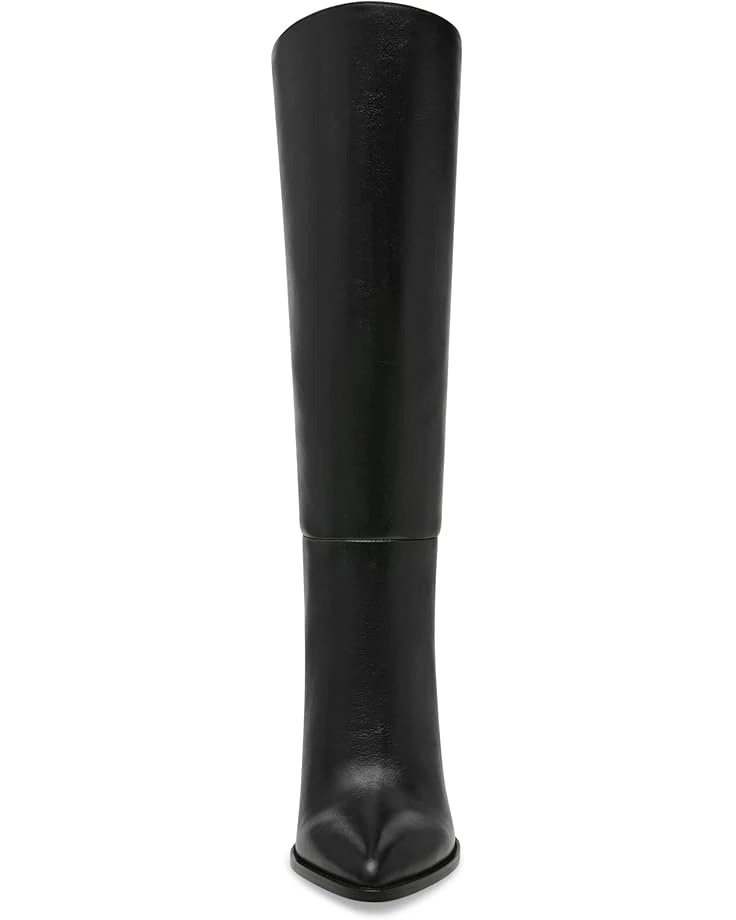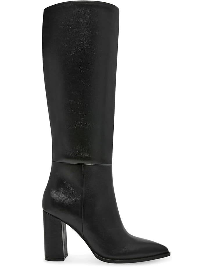 - The monochrome design of the Steve Madden® Brittan mid-calf boot emphasizes the block heel silhouette finished with a pointed toe. The pull-on footwear features leather upper with polyurethane lining and rubber insole for all-day comfort.