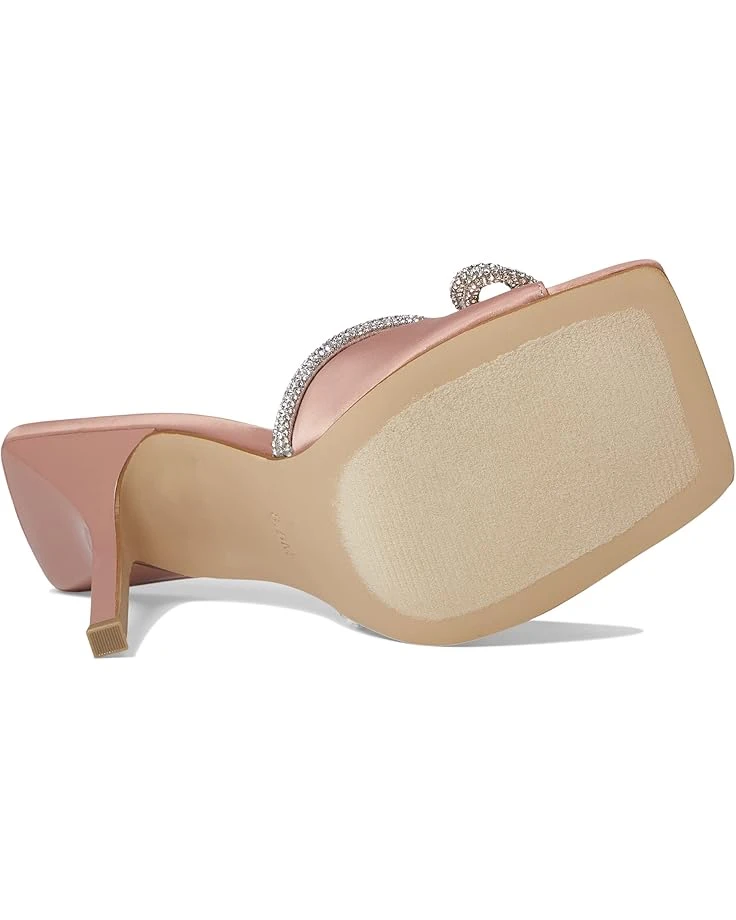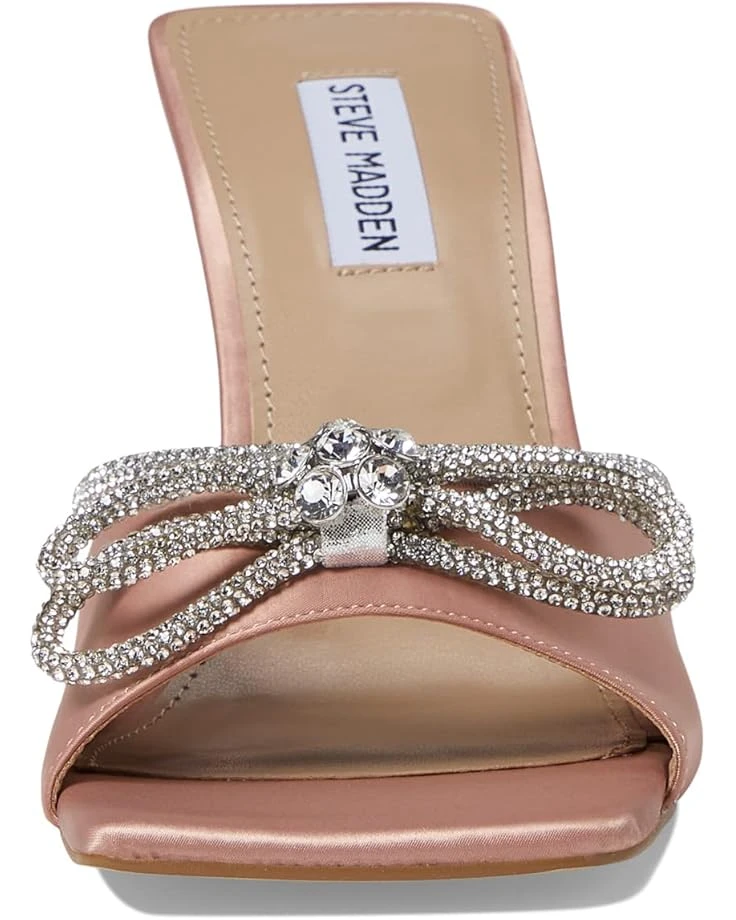 - Front strap is adorned with iridescence and rhinestones on the bow detail.