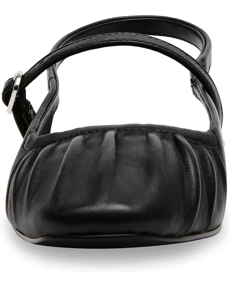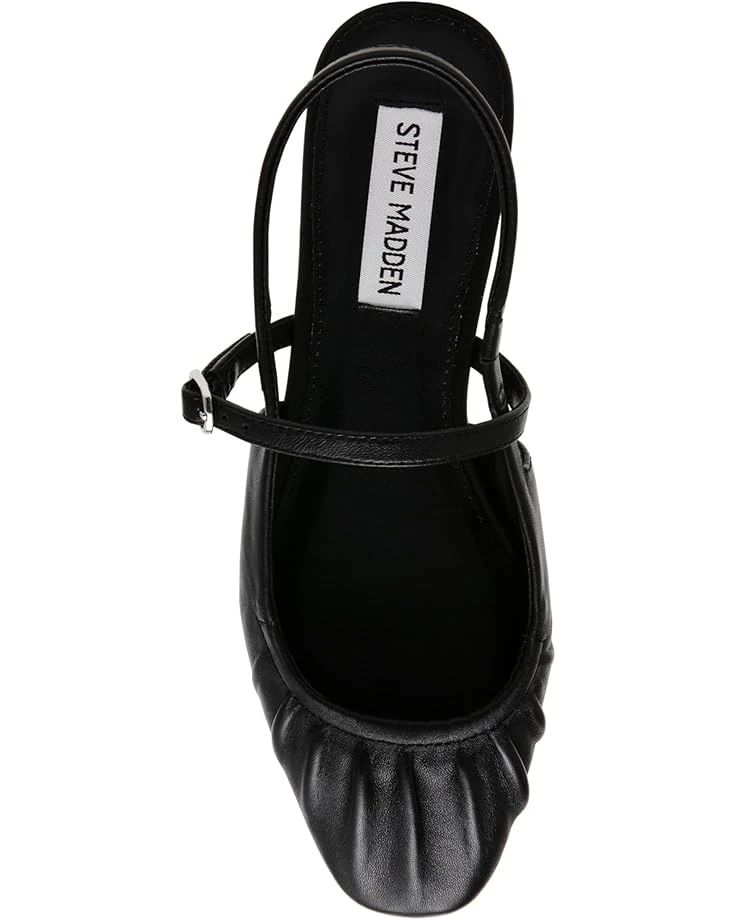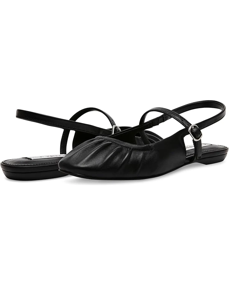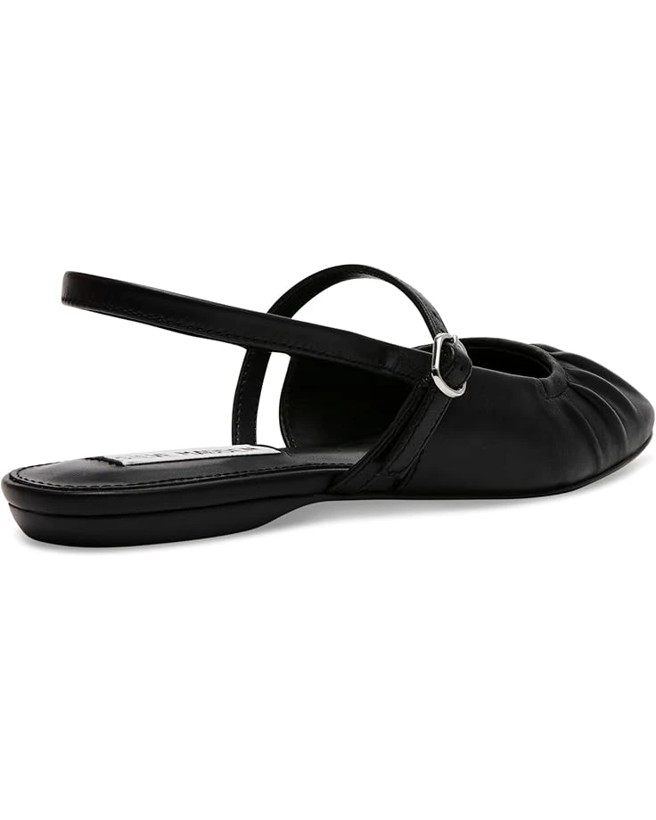 - Discover the essence of classic elegance and premium comfort as you step out wearing the Steve Madden® Garson Flats. Showcasing a timeless ballet-inspired Mary Jane style, these everyday shoes are crafted with leather upper that highlights gathered pleated detailing around the toe and a slender slingback ankle strap teamed with a buckled instep strap, offering a secure and comfortable fit.