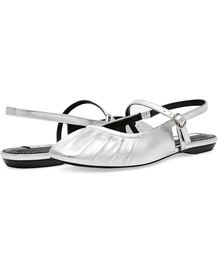 This is a great option for a ballet flat/mary jane style shoe but with a twist..sling back. This shoe is identical to the Gisele Steve Madden that Nordstrom was selling during the anniversary sale except the Gisele is a mule style and even on sale at the anniversary sale cost more then this did on sale. Shoe definitely runs 1/2 size small. Have been looking for a silver ballet flat/mary jane for a while that I liked and this is perfect.