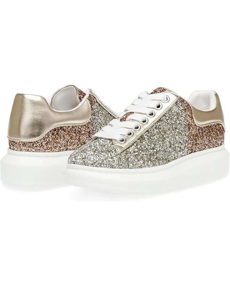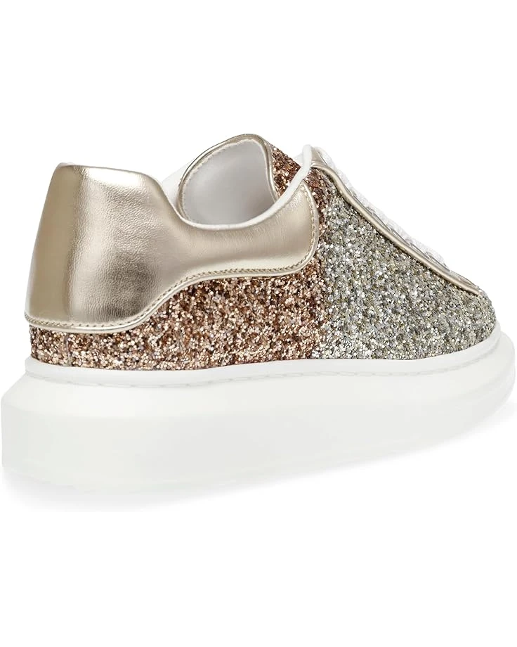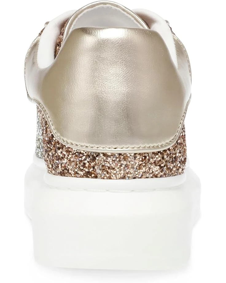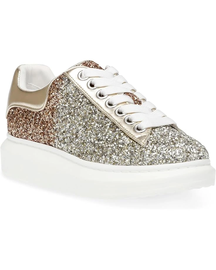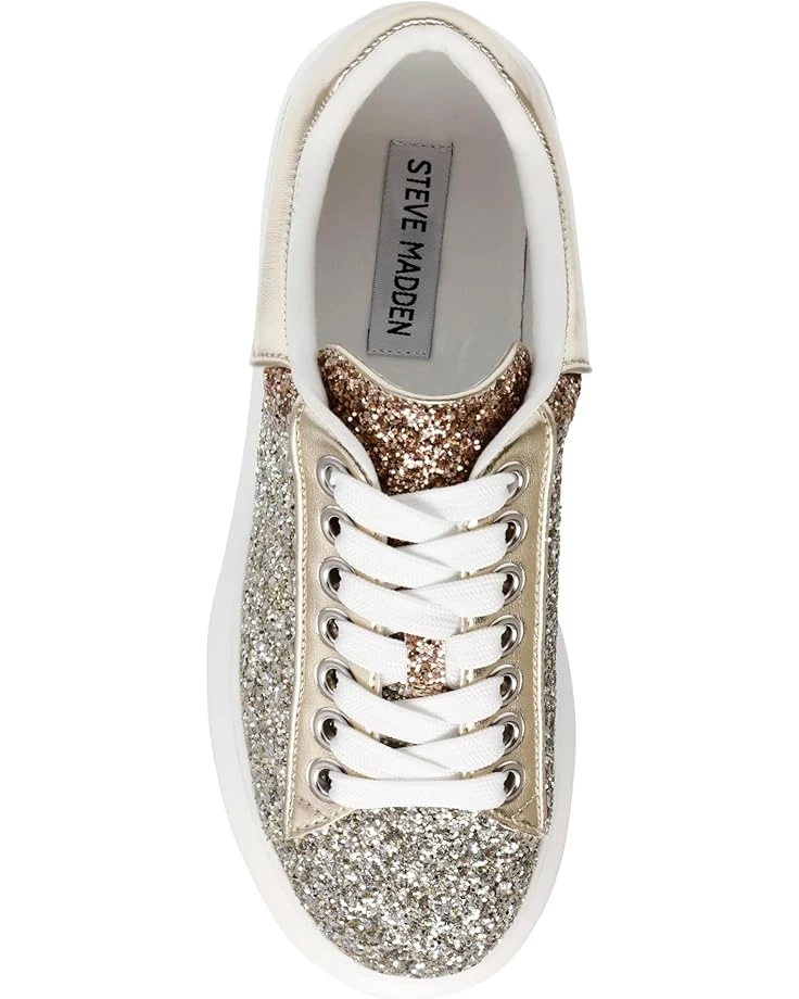 - Add some dazzle to your casual ensemble wearing Steve Madden® Glacer-G sneakers. Crafted from rubber upper, the sneakers feature synthetic rubber lining, and rubber insole. A round toe, lace-up closure, and low-top design makes it streamlined to feet. Allover glitter detail and metallic overlays on the heel offer a touch of elegance on every step.