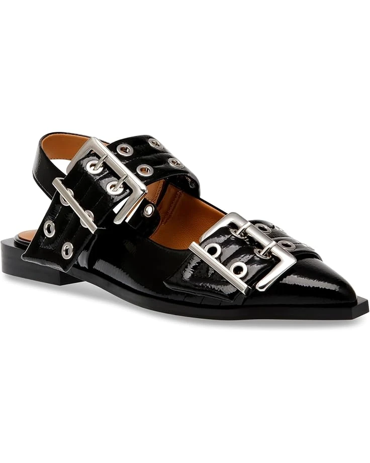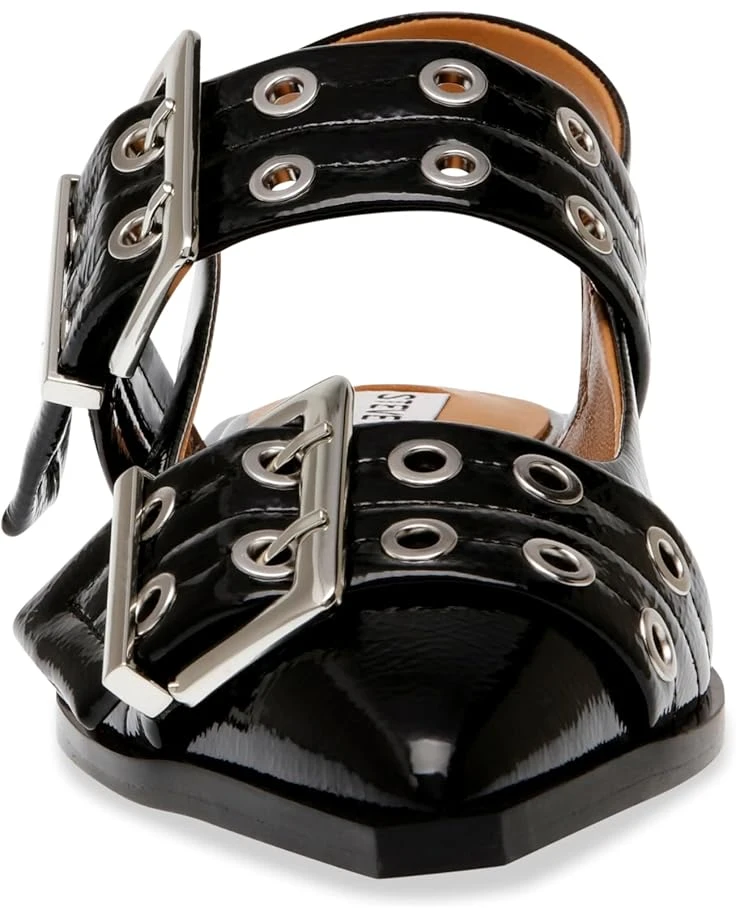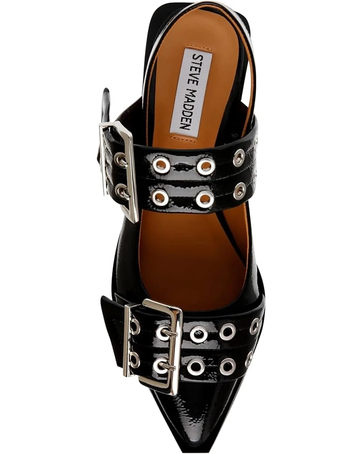 - All eyes will be on you no matter where you go wearing the Steve Madden® Graya Slingback Flats. Framed in a sleek pointed toe silhouette with a snipped sole and a low block heel, these shoes impress with wide grommet upper straps with oversized buckle closures. The shoes are lightweight and possess a padded leather insole for all-day wear.