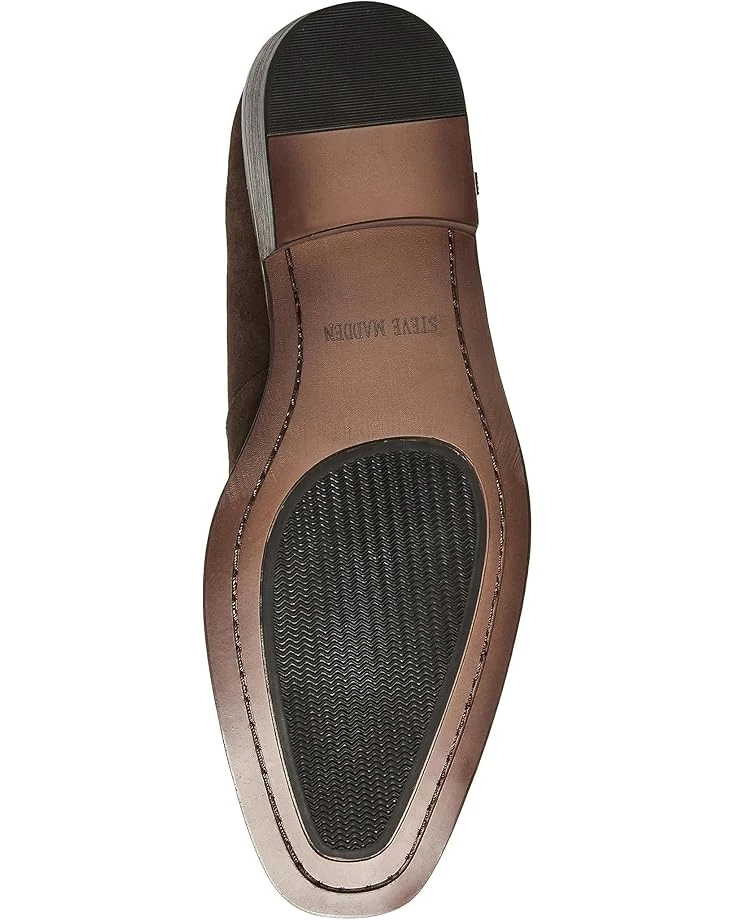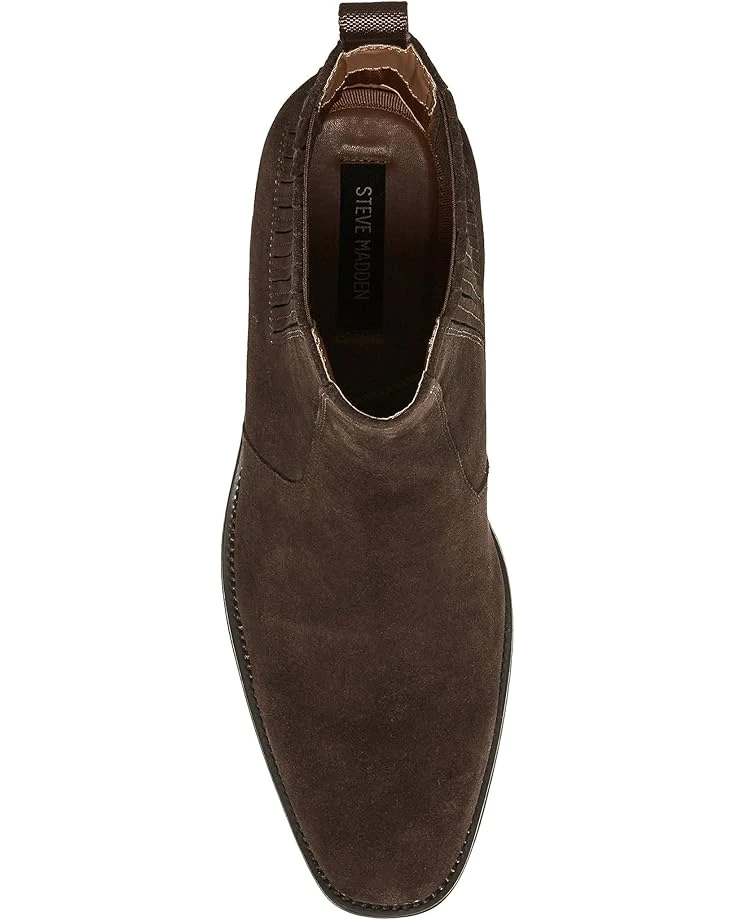 - Step in style and create your own footprints by wearing the Steve Madden® Huston boots. The highline pull-on style boots have suede upper with textile and synthetic lining and a padded footbed for added comfort. The boots have elastic finger-gore inserts. The round-toe boots have ankle pull-on tabs for donning and doffing easy and riding heels to complete the look.