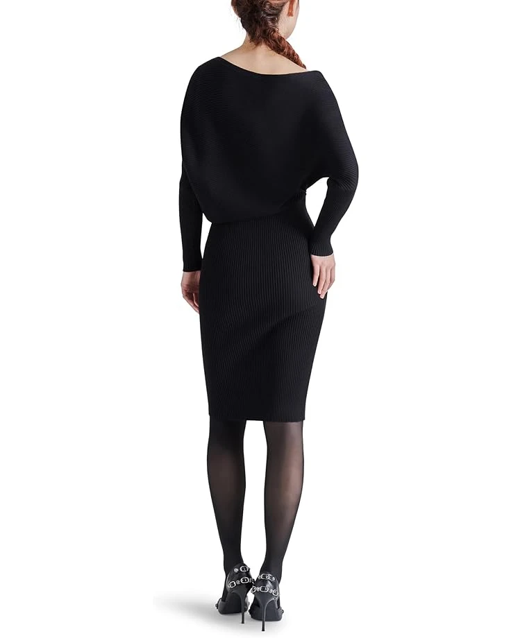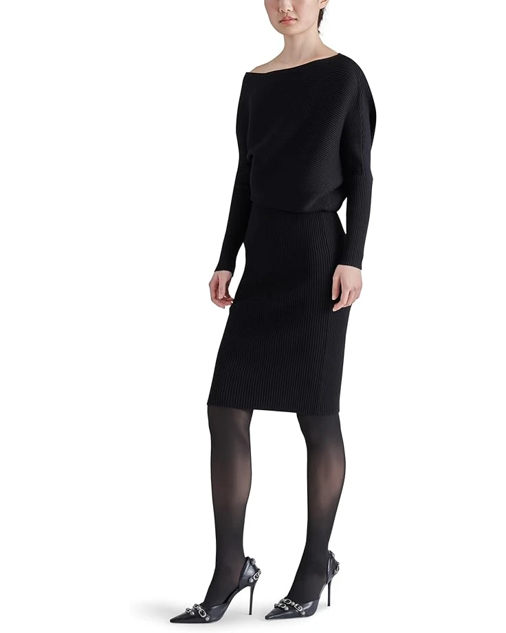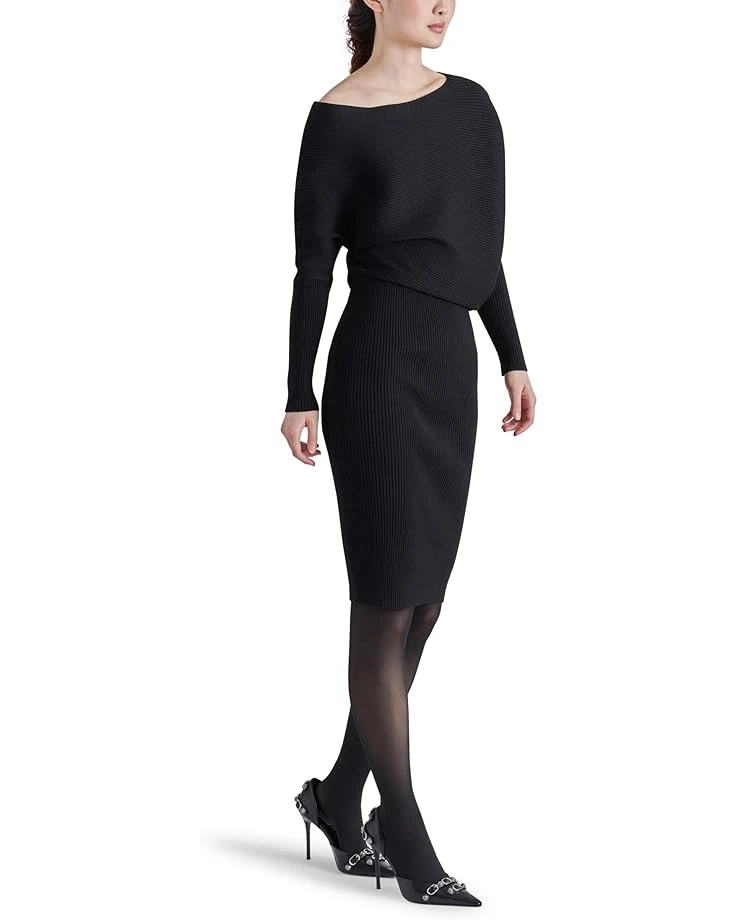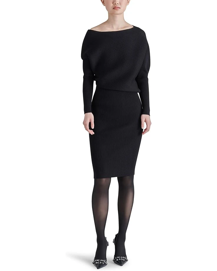 - When those chilly days strike around the corner, all you need is an ensemble that looks stylish and offers you exceptional coziness and comfort just like the Steve Madden® Lori Sweaterdress. Featuring a ribbed knit fabrication, the dress displays a slouchy bodice with an off-the-shoulder, asymmetrical neckline and fitted long sleeves. The bottom of this dress flaunts a striking midi-length, pencil skirt that hits the knee.