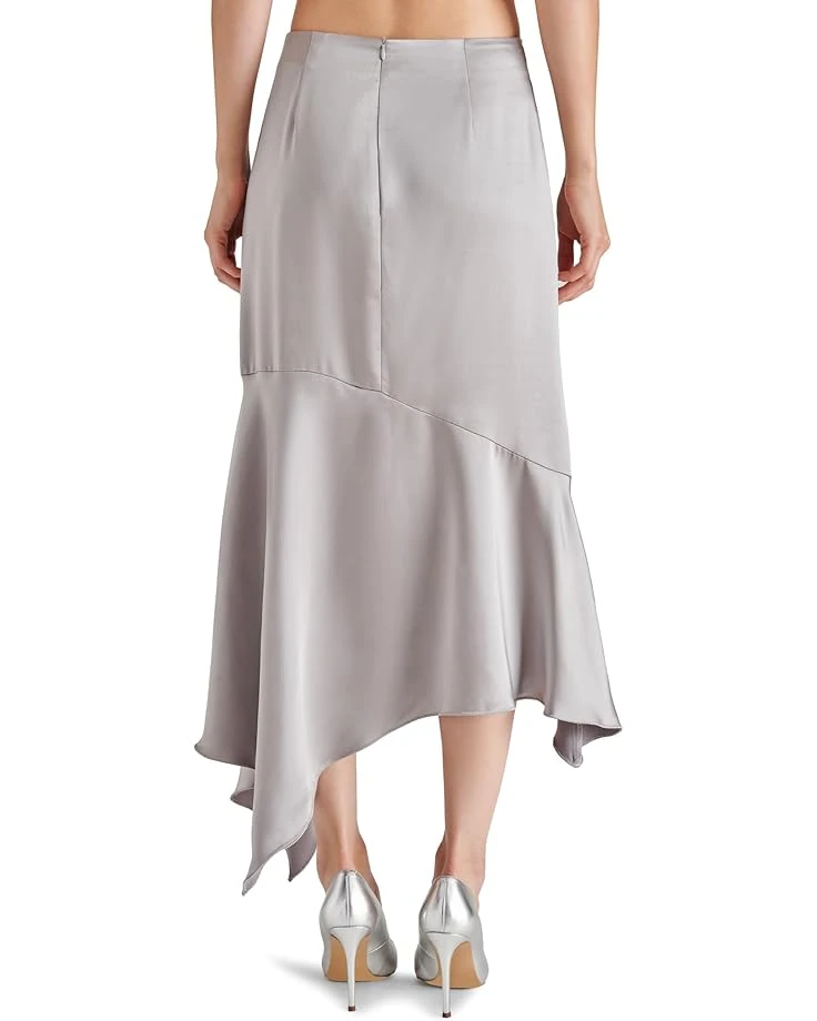 - Style your party look in the graceful elegance of this luxe satin midi-length Steve Madden® Lucille Skirt with an asymmetrical bias cut hem and concealed zippered closure at the back.