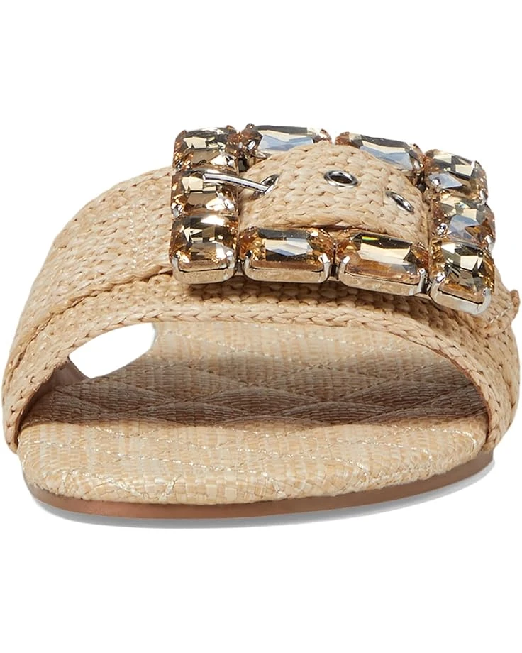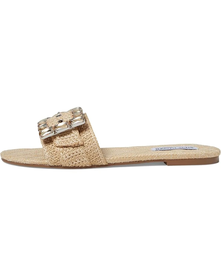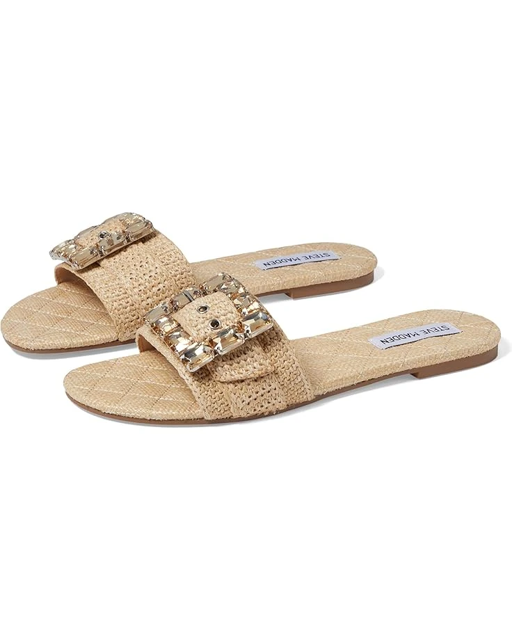 - Glam up your warm weather look by styling with the Steve Madden® Marika Sandals. Chic yet comfortable, these slip-on sandals are topped with a chunky rhinestone-ornamented buckle on the woven raffia upper paired with a synthetic lining and footbed.