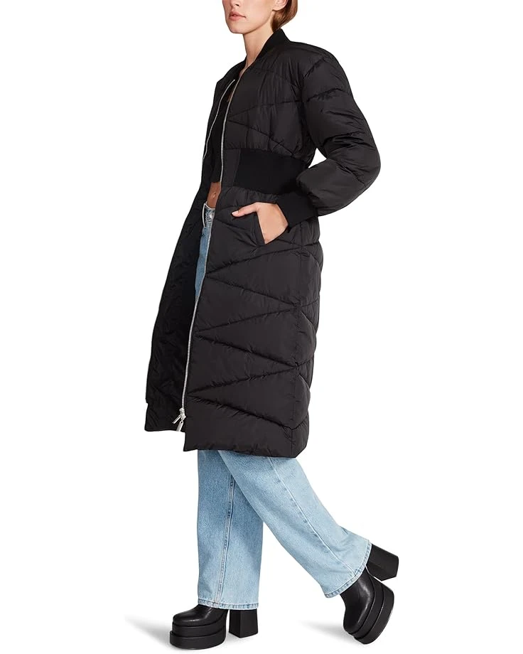 - Warm, stylish and flattering: it’s the Steve Madden® Norma Coat. This coat is a long-sleeve puffer with a ribbed waistline for a cinched silhouette, front zipper for closure and mid-calf hem.