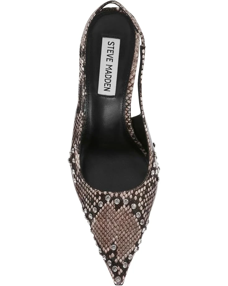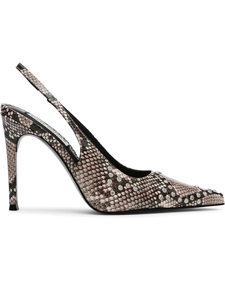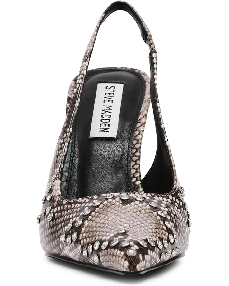 - Featuring an on-trend snake print in combination with shimmery rhinestone embellishments, the Steve Madden® Reyes-R Heels bring a striking twist to your evening look. Created in an elegant silhouette with an elongated pointy toe, a tapered stiletto heel, and a slingback strap, the shoes add a polished appeal to your attire while offering you a secure fit.