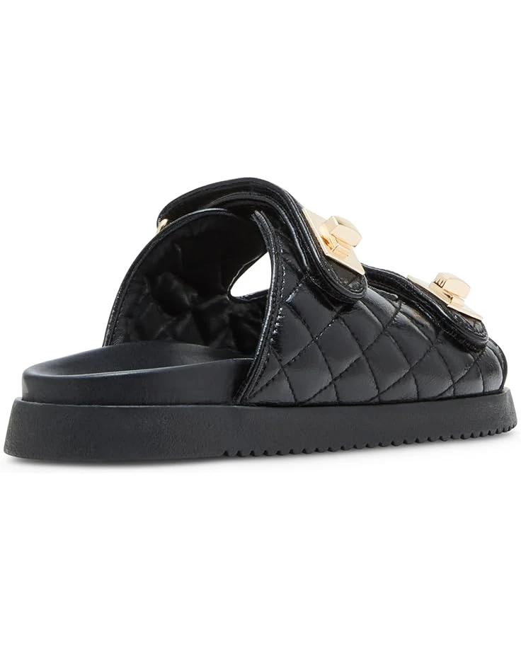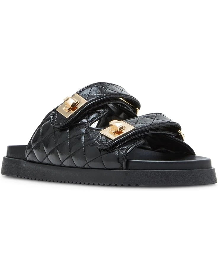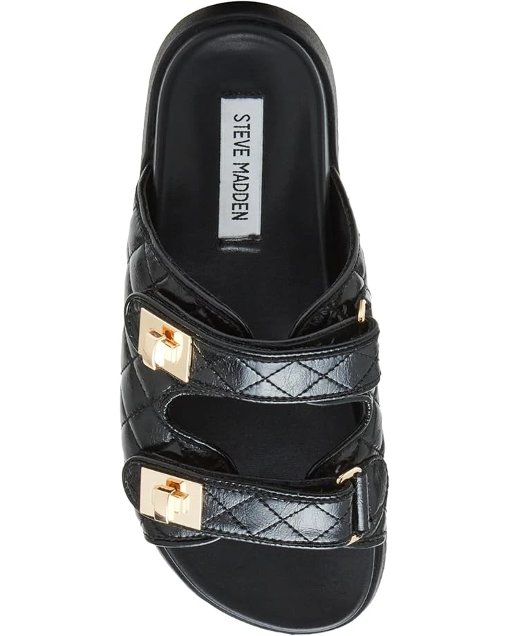 - Own your look, own your day styling Steve Madden® Schmona: Leather luxury meets sporty chic. Lounge or strut in comfort with its wide, flat synthetic rubber outsole and cushioned footbed. The quilted finish and faux turnlock hardware add an elevated touch to this double-strap slide, while the buckle closure ensures a secure fit.
