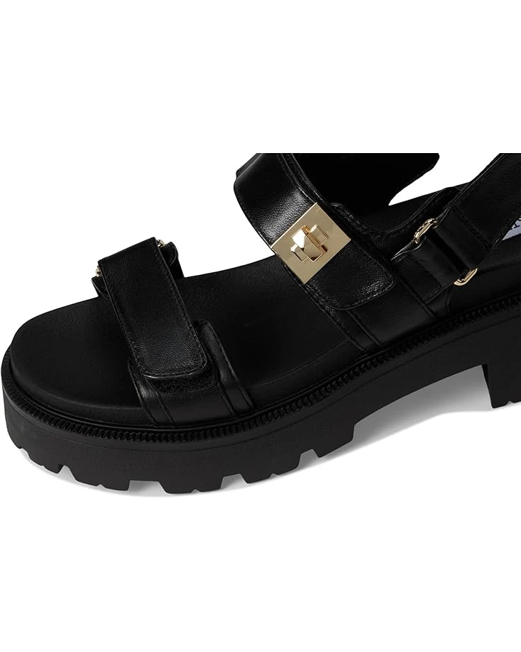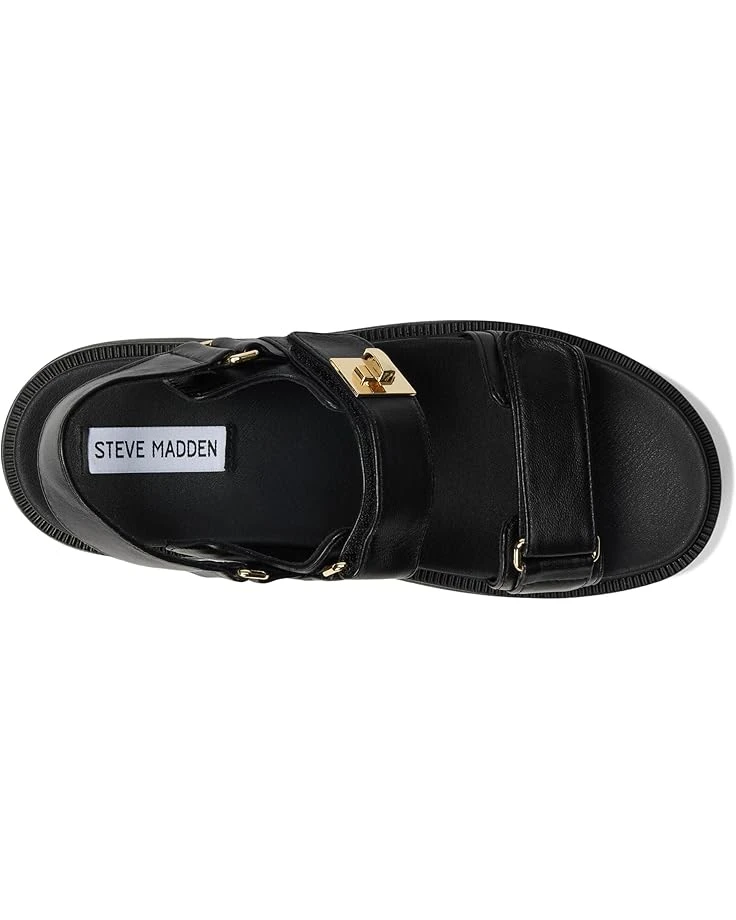 - Get all the style and traction you need for your casual explorations wearing Steve Madden® Supermona Sandals. Designed with a leather upper, faux leather lining, and a faux leather insole, these ensure comfort with every step. The triple strap detail with hook-and-loop closures ensures a secure fit and the chunky block heel adds an elevated touch.